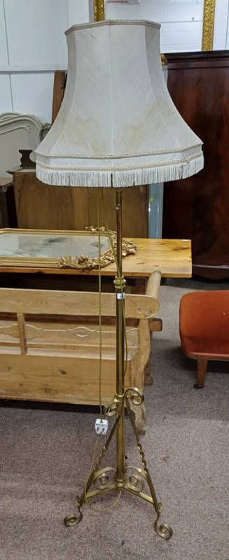 Early 20th century brass standard lamp on 3 spreading supports in the arts & crafts...