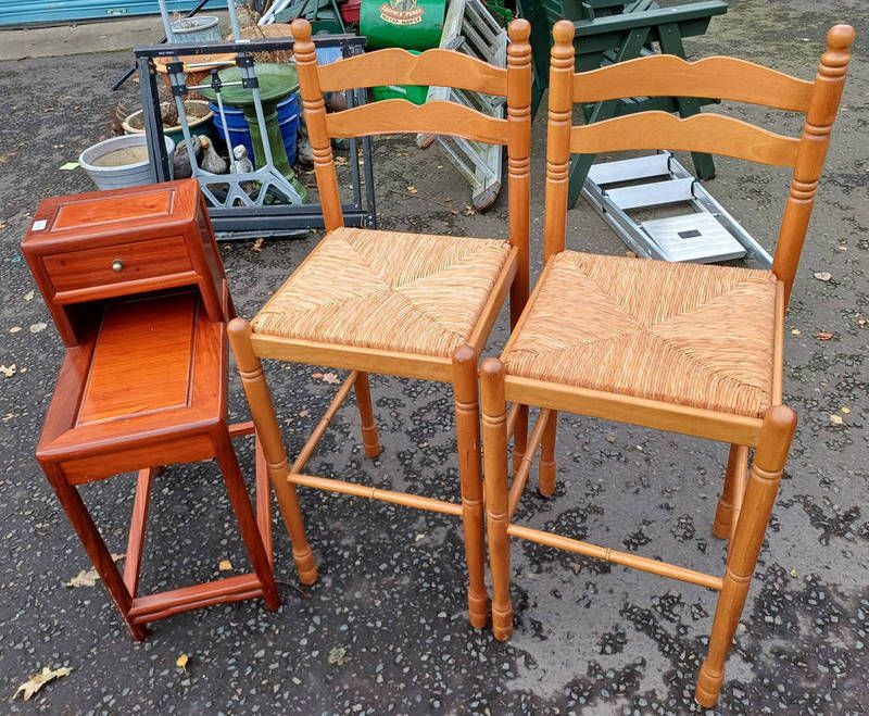 Chinese hardwood phone table with single drawer & 2 kitchen stools with rushwork seats