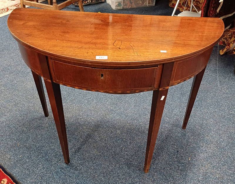 Late 19th century style inlaid mahogany demi-lune games table with satin wood crossbanding on square...