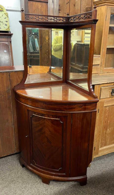 Mahogany bow front corner cabinet with mirrored top over panel door on bracket supports. 163 cm tall