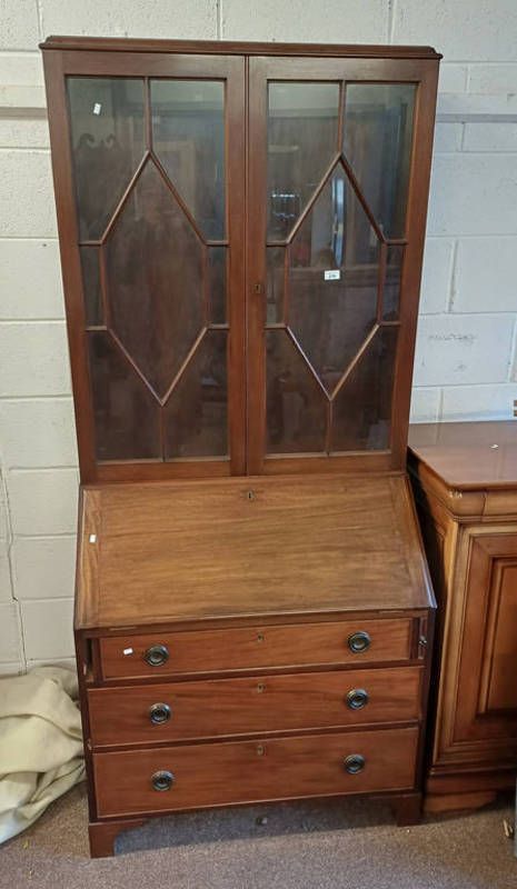 20th century mahogany bureau bookcase with 2 astragal glass panel doors over base with fall front over 3 long graduated drawers - 200 cm tall