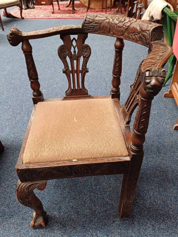 19th century carved mahogany corner chair with lion mask arms on ball & claw supports