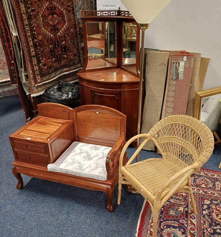 Chinese hardwood phone seat with 2 drawers on ball & claw supports, wicker armchair & uplighter
