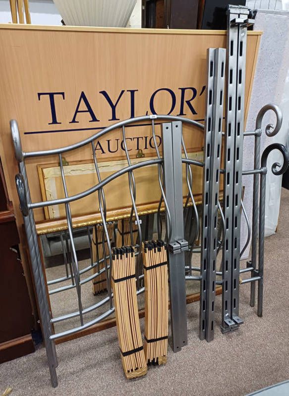 Phone table with metal fittings & 3 drawers, overstuffed bedroom chair, metal standard lamp etc.