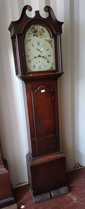 19th century oak longcase clock with painted dial with bird & floral decoration indistinctly signed