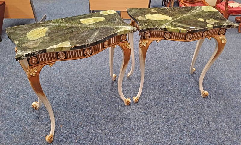 Pair of painted side tables with serpentine tops on long cabriole supports - 88 cm tall