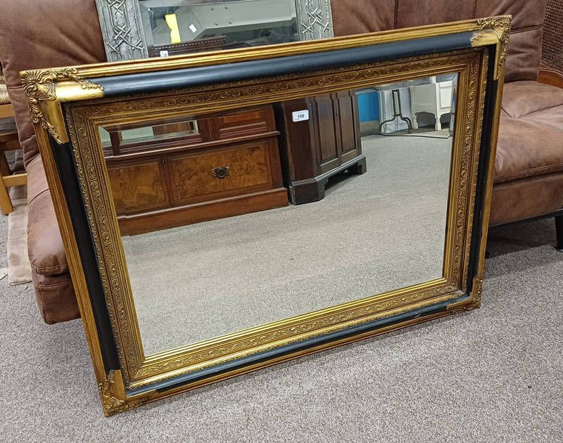 Decorative black & gilt framed rectangular overmantle mirror with bevelled edge - glass dimensions 59cm x 90cm