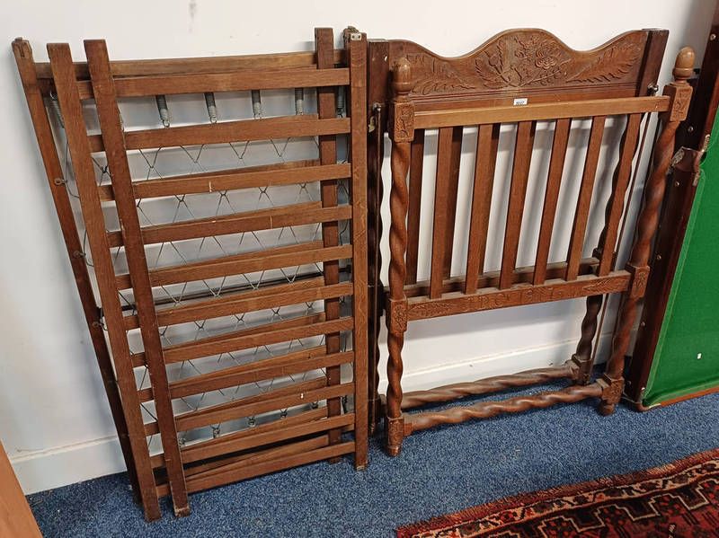 Oak cot with carved ends & barley twist decoration in the arts & style initialed j.d.c 1917