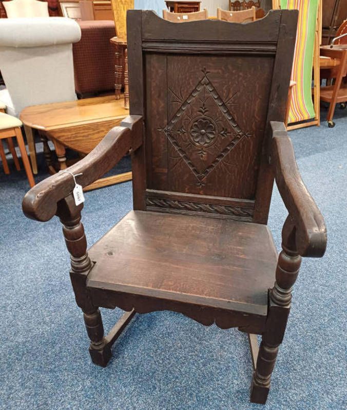 Late 18th or early 19th century oak open armchair with carved panel back - 121...