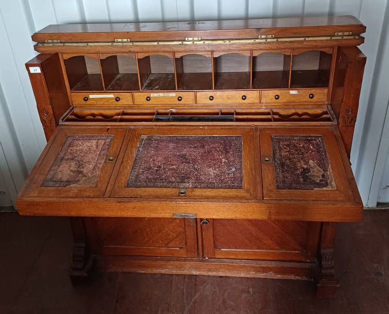 Late 19th or early 20th century oak secretaire cabinet with fall front opening to fitted interior over 2 panel doors - 109 cm tall x 122 cm wide