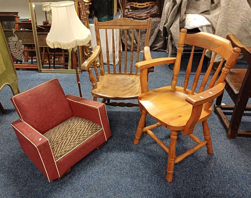 Overstuffed child's armchair, mahogany spindle back armchair, etc