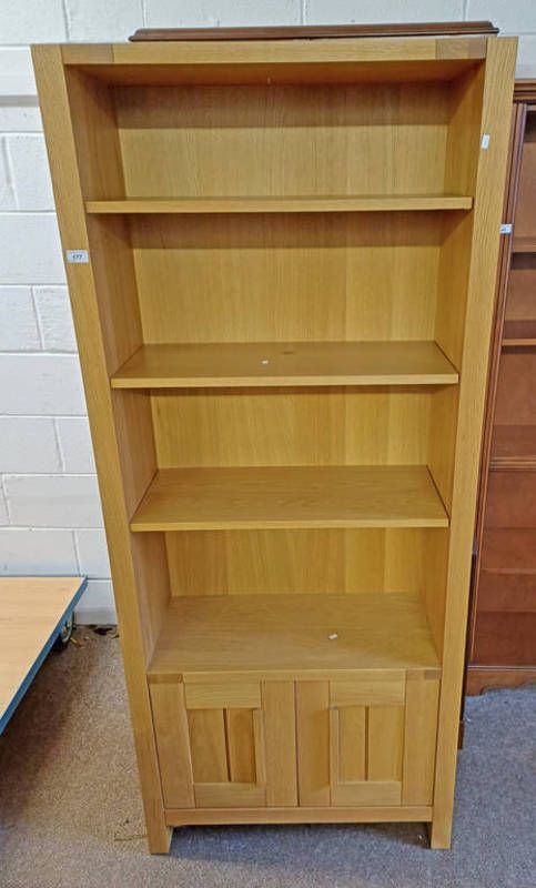 Modern oak open bookcase with 2 panel doors to base 188 cm tall