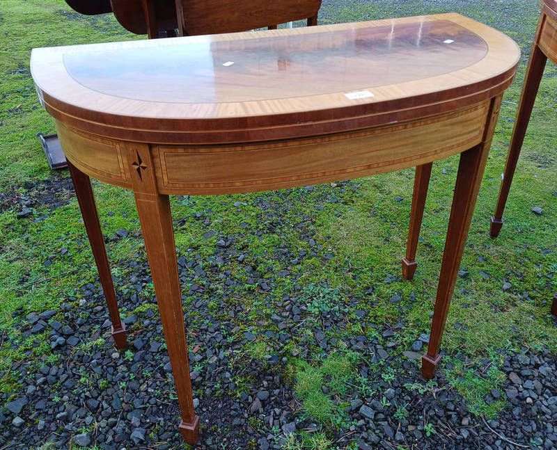 Late 19th century style inlaid mahogany demi-lune games table with satin wood crossbanding on square...