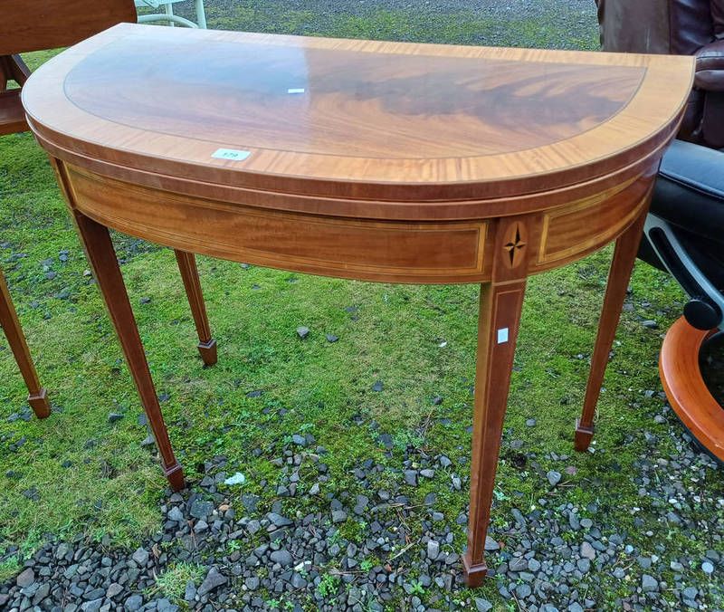 Late 19th century style inlaid mahogany demi-lune games table with satin wood crossbanding on square...