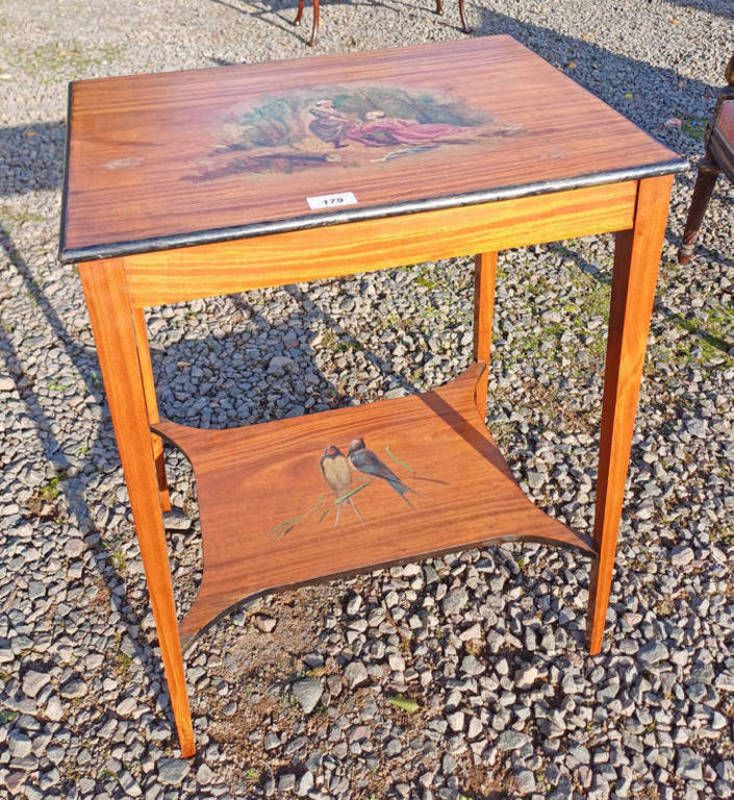 Early 20th century satin wood lamp table with classical scene to top & twin swallows to under shelf on square tapered supports. 69 cm tall x 51 cm wide