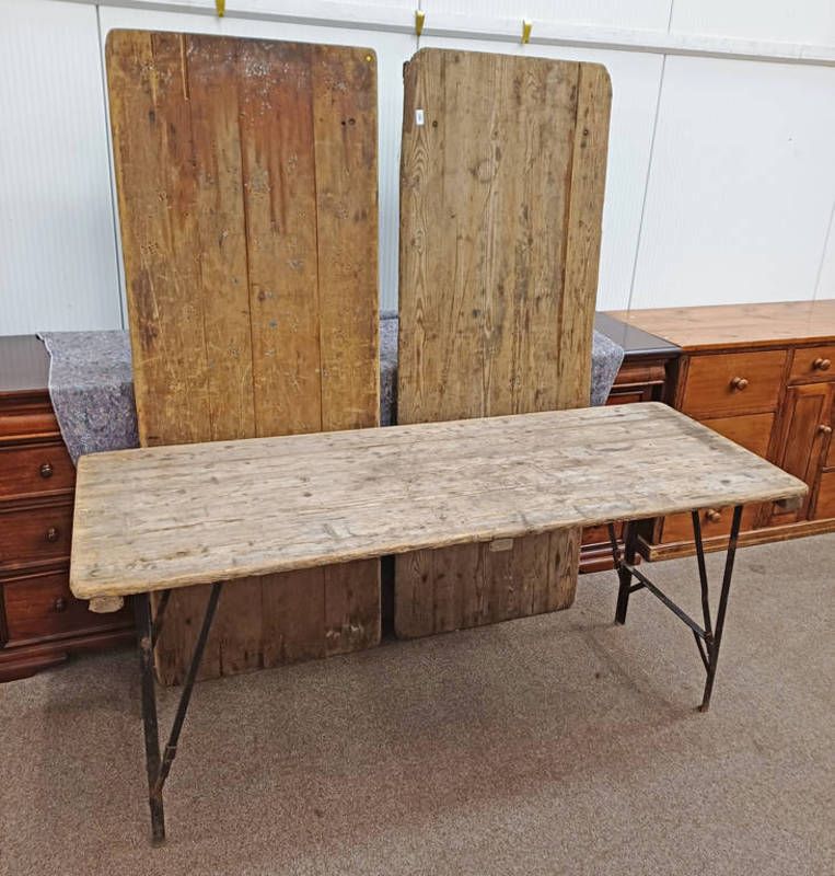 3 rustic pine tables on folding metal supports all marked ahs to underside - 181 cm long