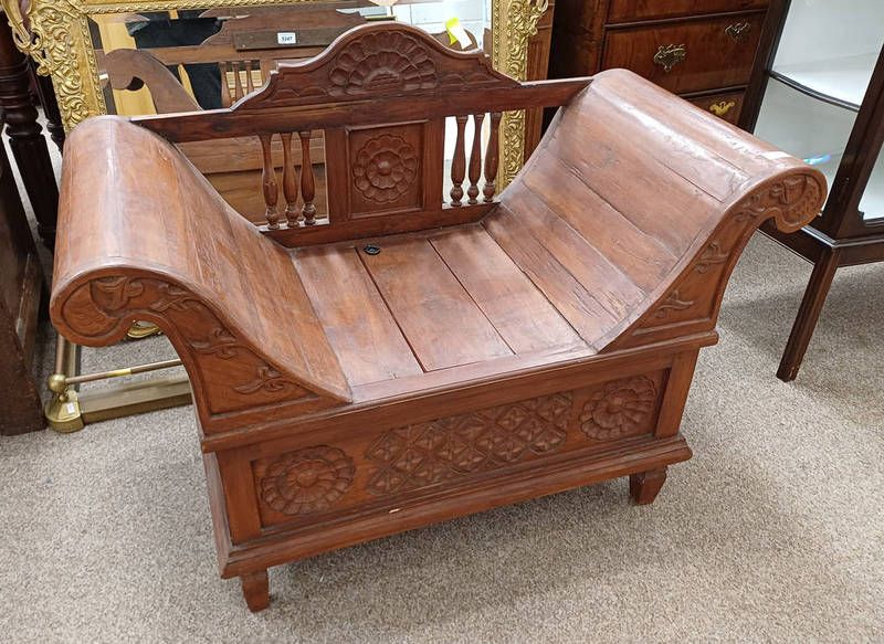Hardwood scroll arm bench with carved floral decoration & lift lid seat, 106cm wide