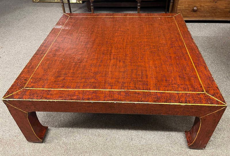 Large chinese red lacquer coffee table on square supports with chinese customs permission wax seal to underside - 121 x 121 cm