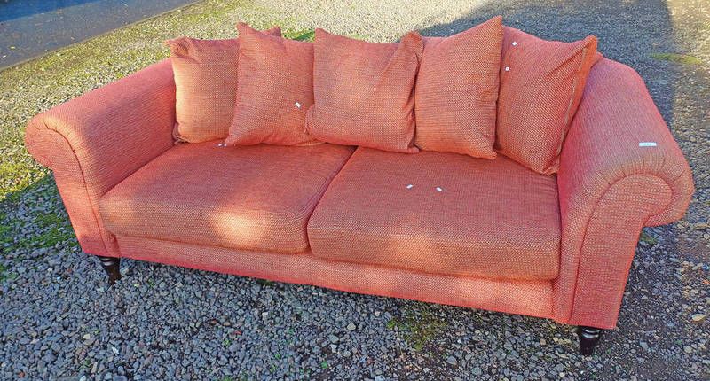 Red fabric overstuffed chesterfield settee on turned supports