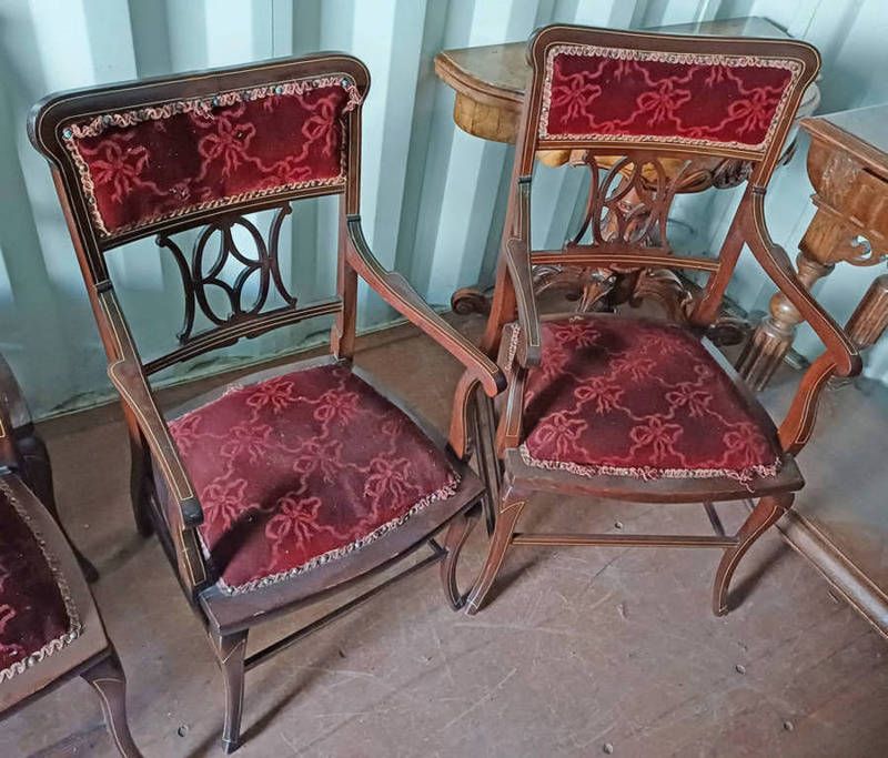Set of 4 early 20th century inlaid mahogany hand chairs with fret work backs on...