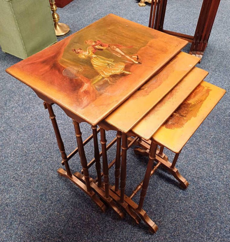 Nest of 4 tables with gilt & painted decoration of 17th/18th century figures dancing - 71 cm tall