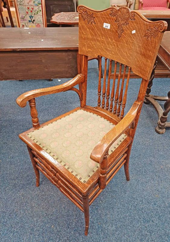 Early 20th century oak spindle back open armchair on splayed supports