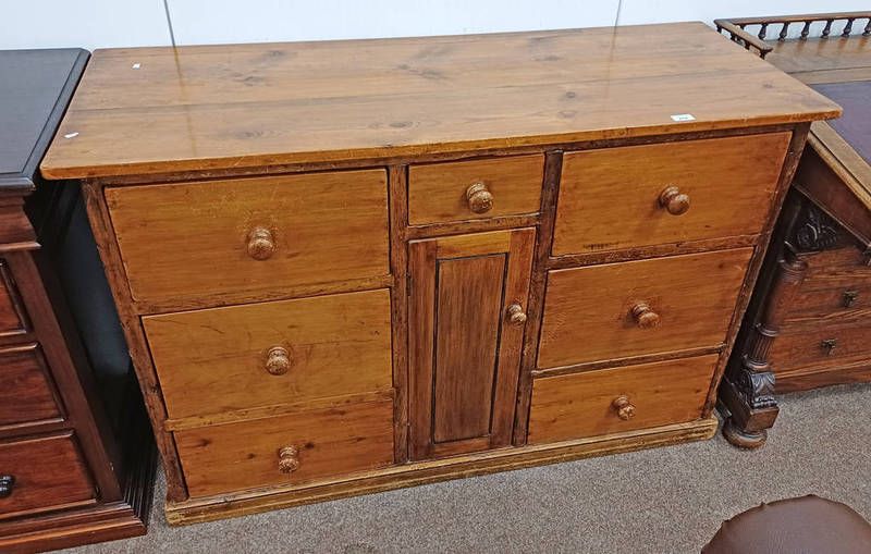 Pine dresser with centrally set drawer over panel door flanked to each side by 3 drawers - 136 cm long