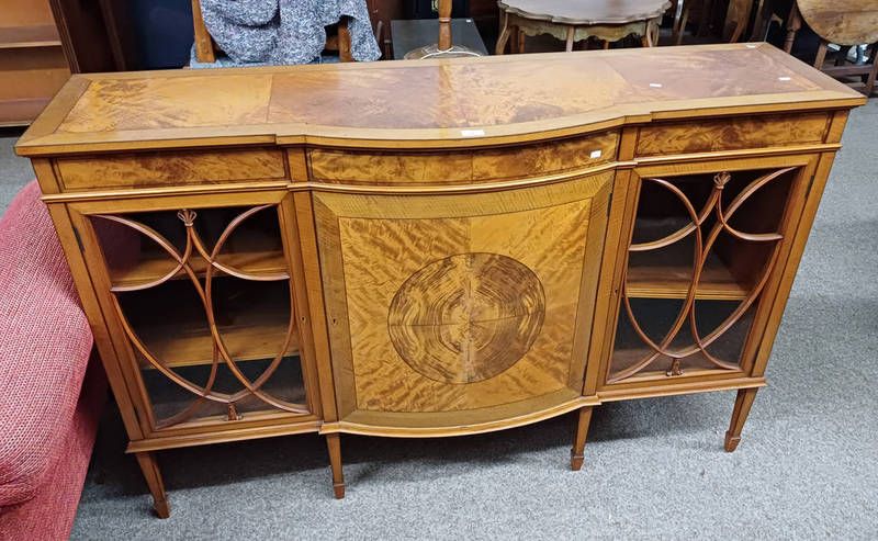 20th century inlaid satin birch bookcase with centrally set shaped front panel door flanked by 2 astragal glass panel doors on square tapered supports - 98cm tall x 153cm long
