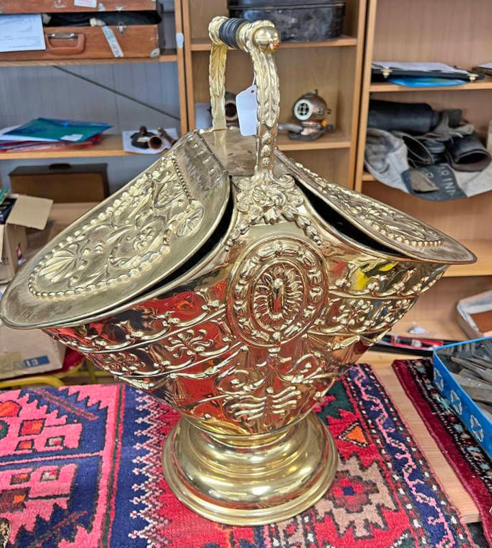 Late 19th century style brass double sided coal bin with embossed decoration, 57cm tall