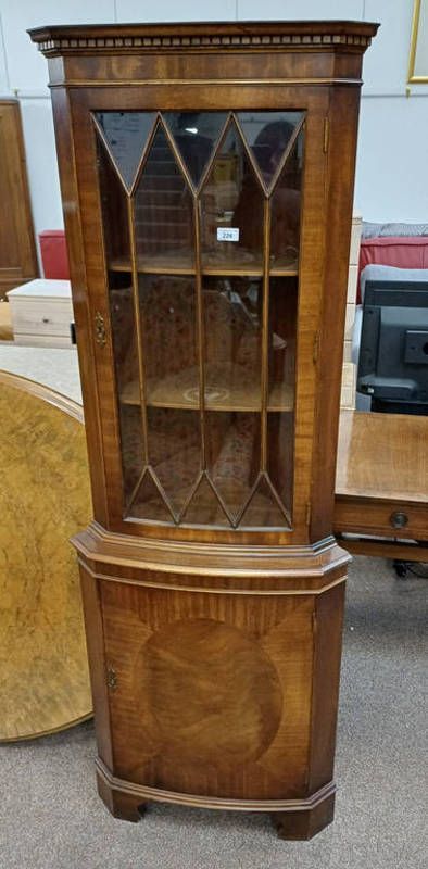 Early 20th century inlaid mahogany corner cabinet with 2 astragal glass panel doors over 2...
