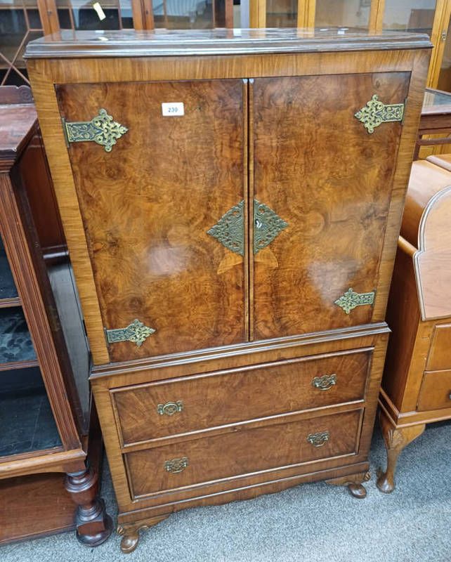 20th century walnut cabinet with 2 panel doors over 2 drawers on short queen anne supports - 138cm tall x 74cm wide