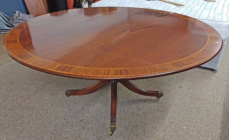 20th century crossbanded mahogany circular pedestal breakfast table on 4 spreading supports by william tillman labelled to underside
