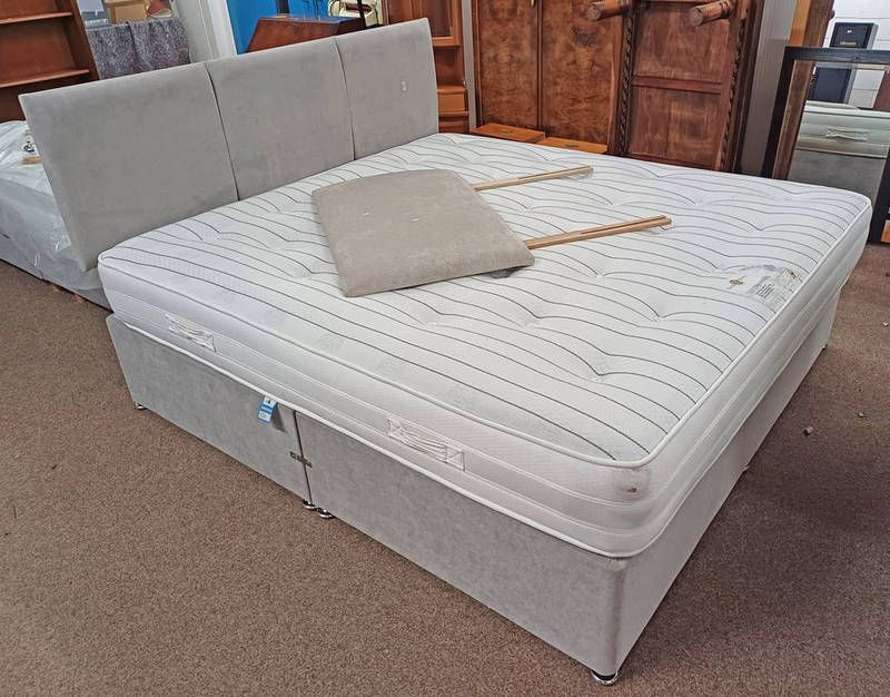 Grey fabric super king bed frame with buttoned headboard & mattress