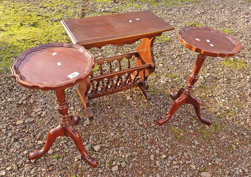 Pair of mahogany pedestal wine tables on spreading supports & magazine rack