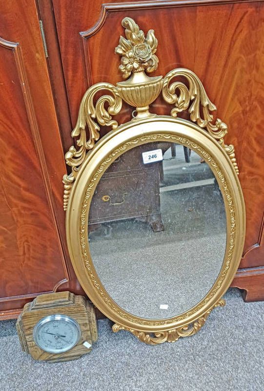 Decorative gilt framed oval mirror & elm framed barometer