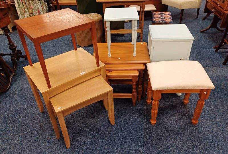 Teak square table labelled 'bent silberg's mobler, made in denmark', painted bedside cabinet, etc.