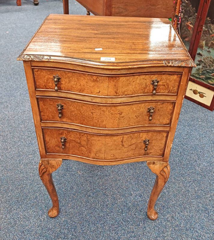 20th century walnut chest with serpentine front & 3 graduated drawers on queen anne supports - 75 cm tall x 48 cm wide