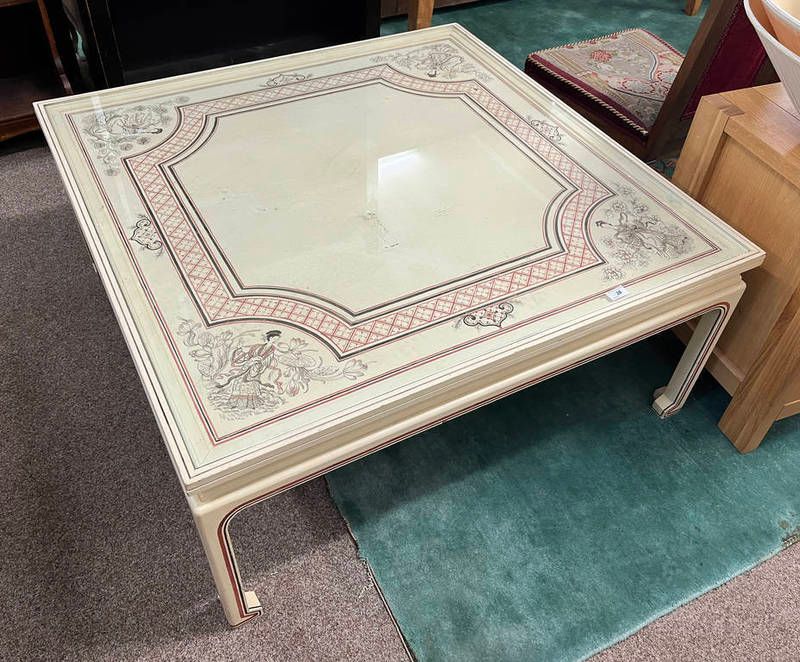 Painted low square coffee table with black & red oriental decoration to top labelled 'the four seasons, spring plum blossom, summer peony, autumn lotus, winter chrysanthemum, specially painted for a. f. drysdale, edinburgh by william mclaren' to underside - 108 cm long