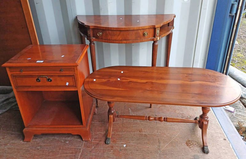 Yew bedside table with slide over single drawer, mahogany side table with single drawer & reeded supports, etc