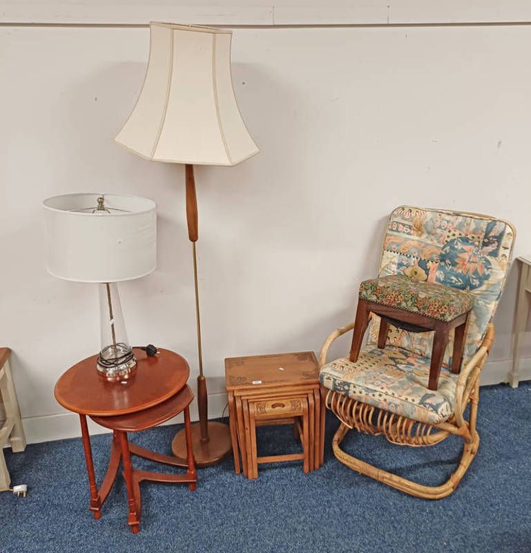 Bamboo armchair, nest of 4 hardwood tables, teak & metal standard lamp etc