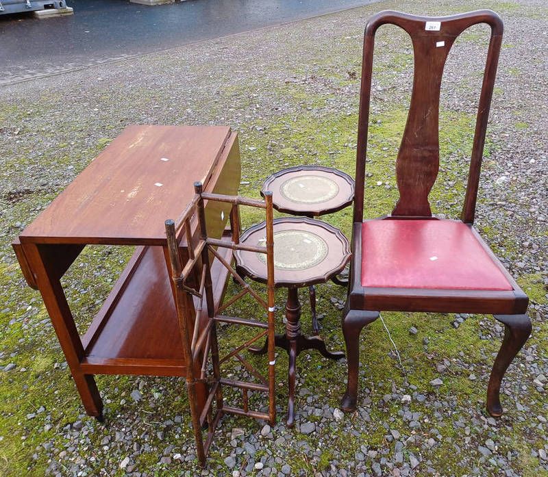 Pair of mahogany wine tables with inset tops, mahogany dining chair, etc