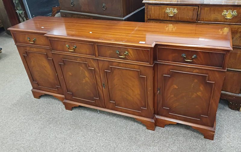 Late 20th century inlaid mahogany breakfront sideboard with 4 drawers over 4 panel doors on bracket supports