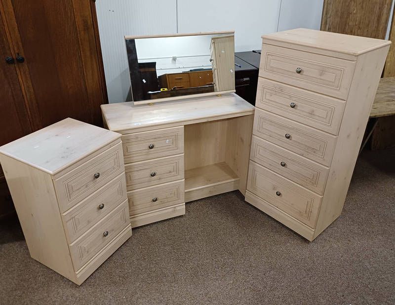 Alstons furniture 3 piece bedroom suite to include 5 drawer chest, dressing table & bedside chest
