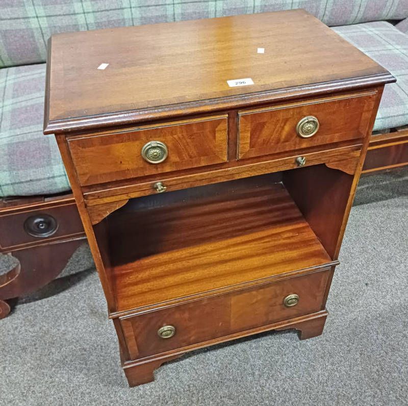Walnut bedside table with 2 short drawers over slide with single long drawer below