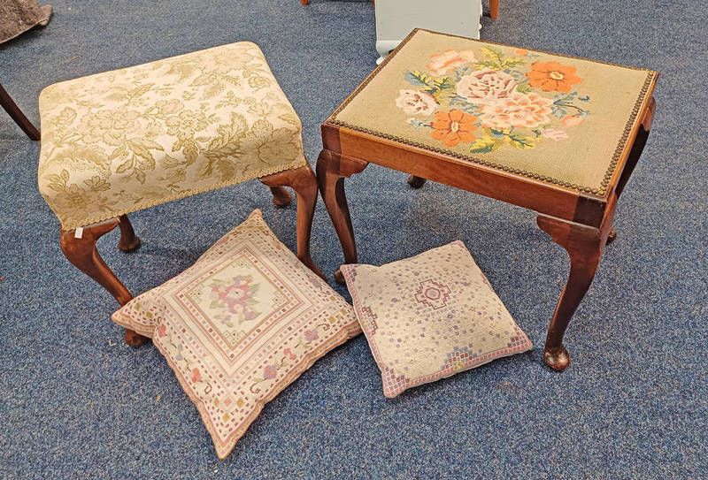 2 mahogany stools on queen anne supports & various cushions