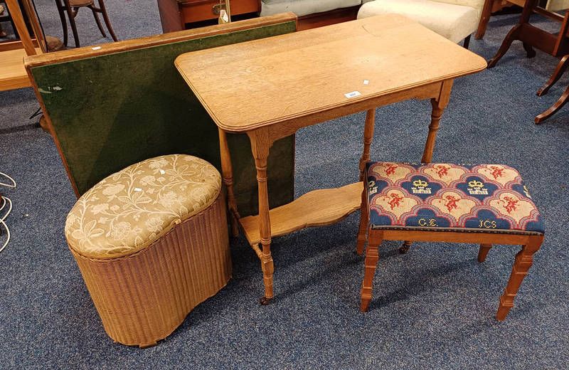 Early 20th century oak table on turned supports, lloyd loom hamper with padded top, etc.