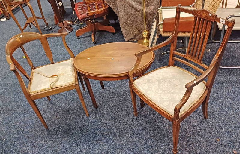 Early 20th century inlaid mahogany open armchair, corner chair & oval table