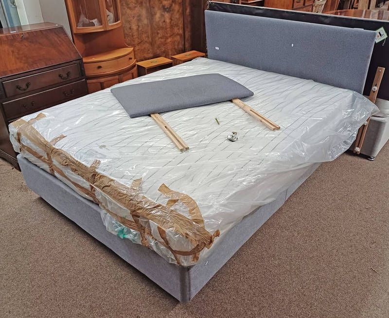 Grey fabric super king bed frame with buttoned headboard & mattress