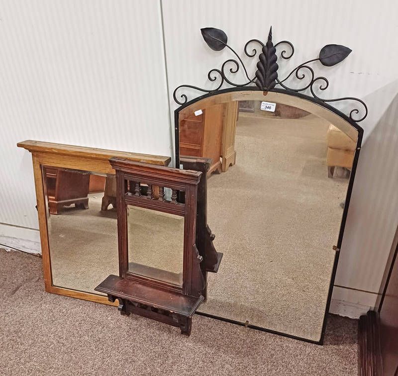 Wrought metal framed mirror surmounted with decorative wire work & 2 other mirrors
