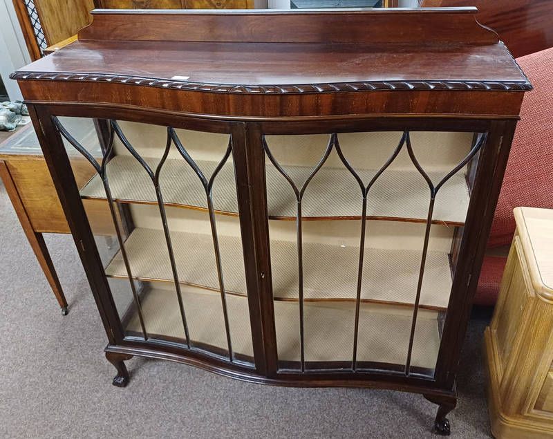 20th century mahogany display cabinet with shaped front & 2 astragal glass panel doors - 129 cm tall x 120 cm wide